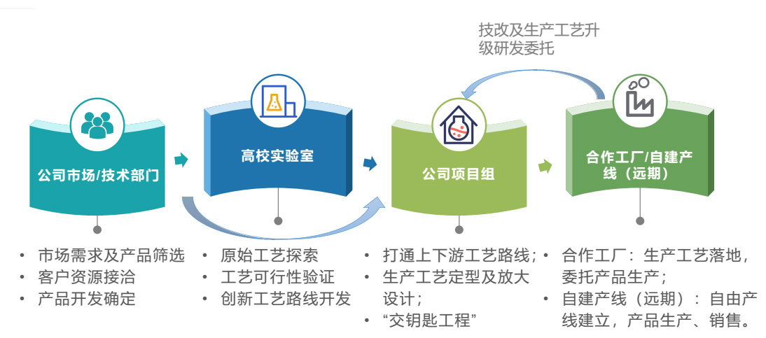 以市場(chǎng)需求為驅(qū)動(dòng),整合市場(chǎng)/技術(shù)部門(mén)、高校實(shí)驗(yàn)室、合作工廠等多方資源,利用各方優(yōu)勢(shì),實(shí)現(xiàn)從產(chǎn)品方向確定、原始工藝探索、生產(chǎn)工藝開(kāi)發(fā)及生產(chǎn)放大落地的全流程。